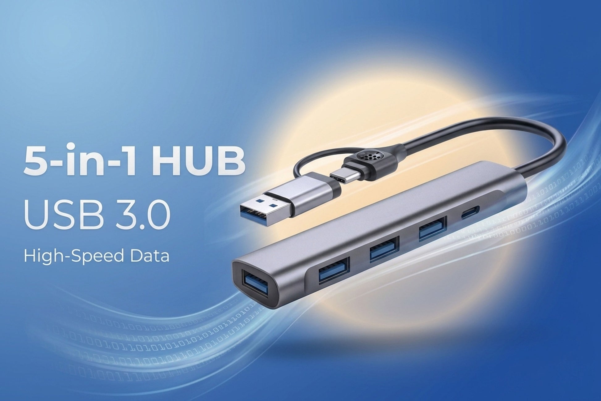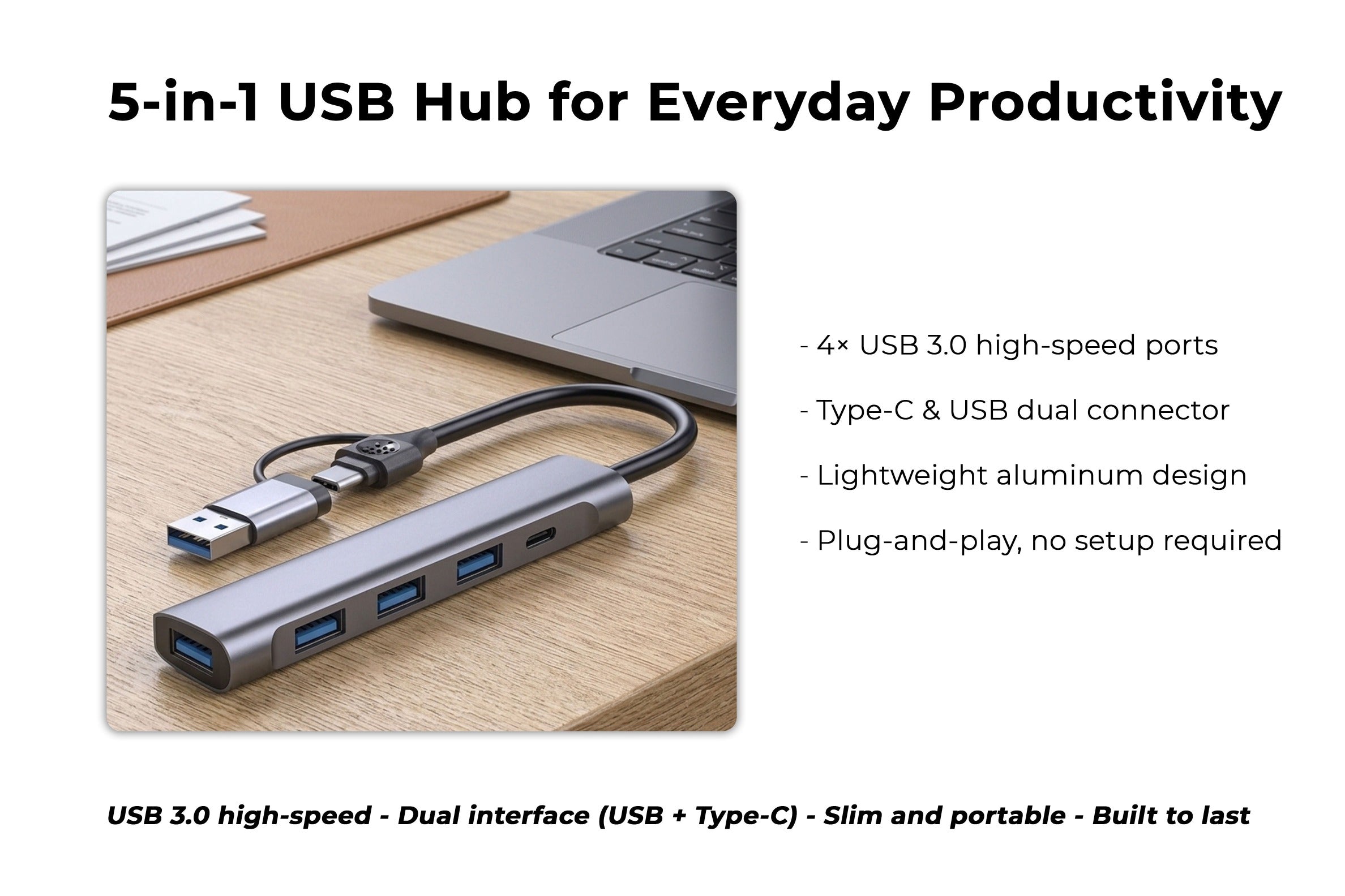 5-in-1 USB 3.0 Hub with USB-C Power Port, 4-Port High-Speed Data Splitter for Laptop & Mobile