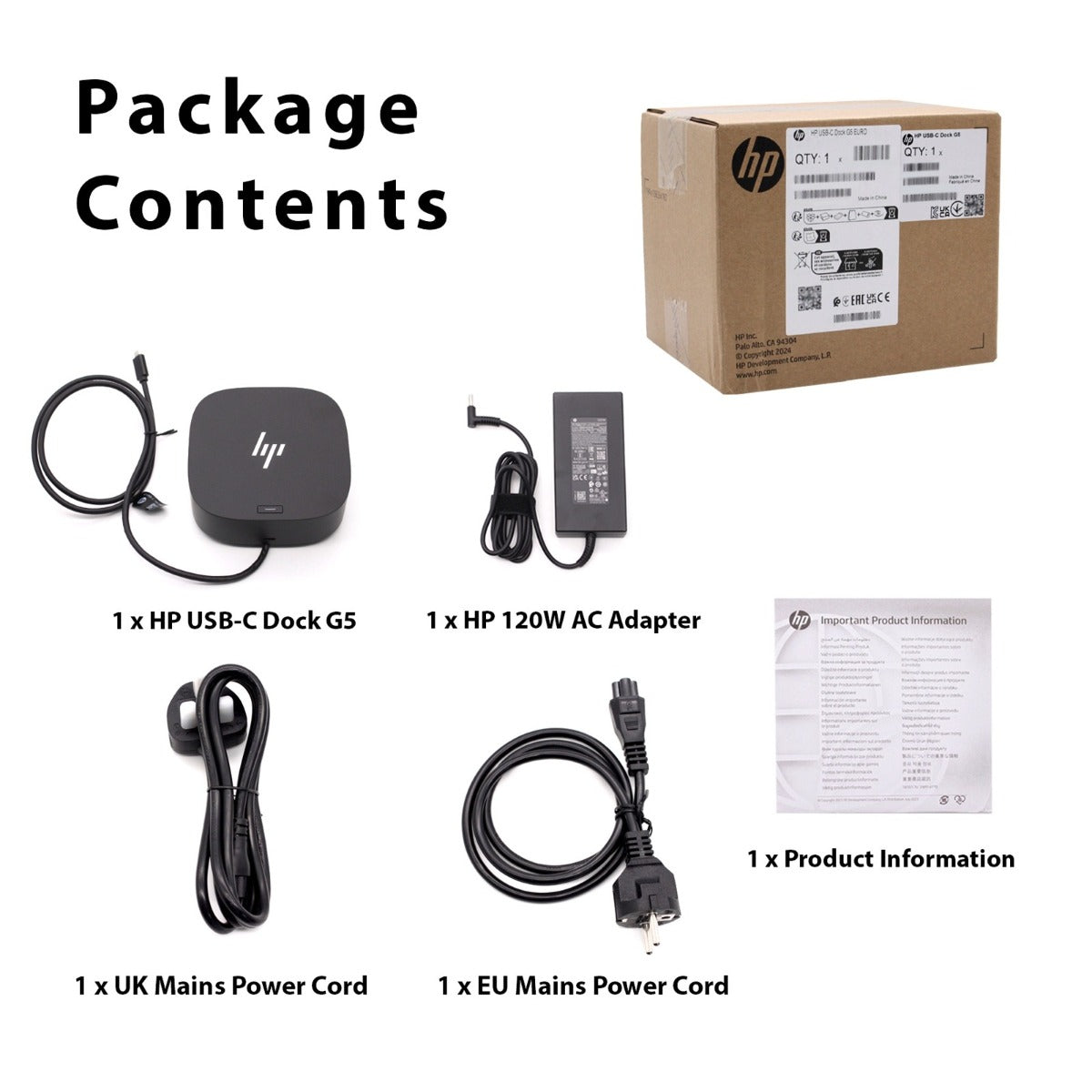 | Package Contents | 1x HP USB-C Dock G5, 1x 120W AC Adapter, 1x UK & EU Power Cords, Product Info Guide |