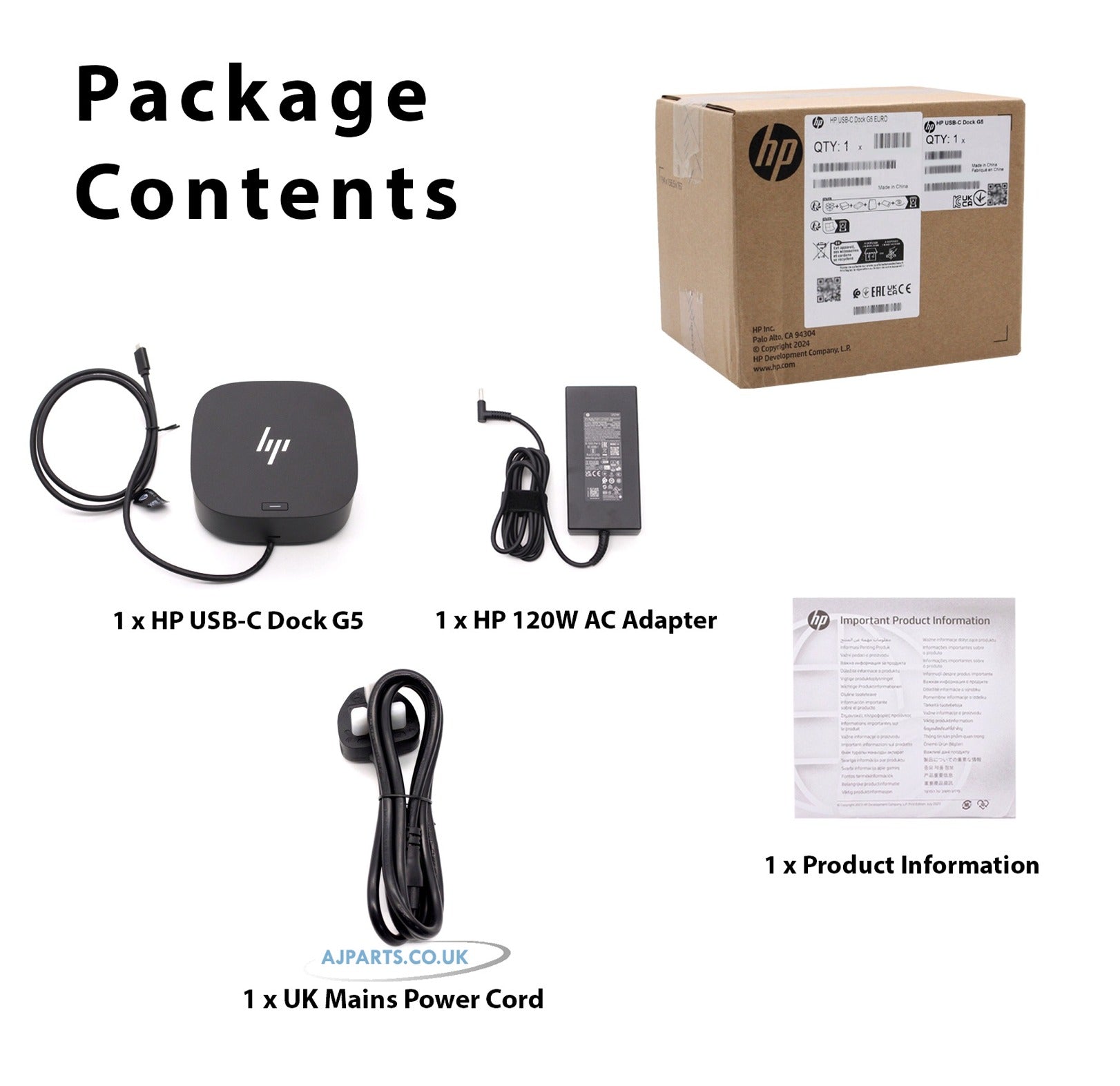 | Package Contents | 1x HP USB-C Dock G5, 1x 120W AC Adapter, 1x UK Power Cords, Product Info Guide |