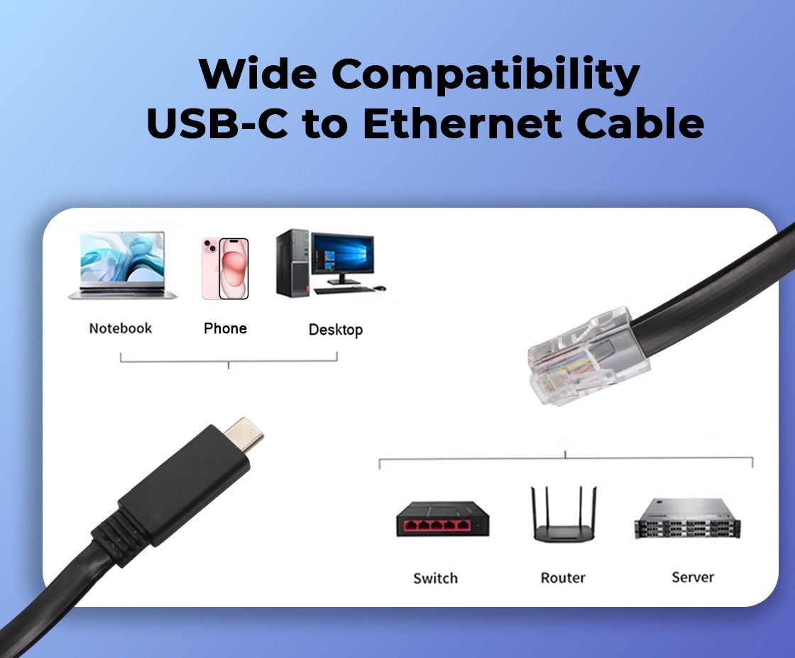 This USB-C to RJ45 Ethernet cable provides a fast and stable wired internet connection for laptops, smartphones, tablets, and desktops. Connect directly to routers, switches, or servers for reliable performance when Wi-Fi is slow or unavailable.